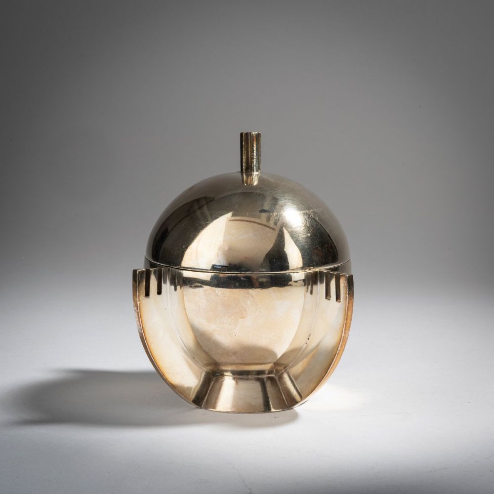 Lot 636. Fraget, Paris, Dose, um 1928. Julia Keilowa, Dose, 1930, H. 14 cm. Ausführung: Jozef Fraget, Warschau. Messing, versilbert, innen vergoldet. Unterseite bez.: Herstellermarke FRAGET, N, PLAQUE (im Oval), 54, 3947, Stern (geprägt). Reserve 900 euro. Quittenbaum Kunstauktionen. 11/18/20. Sold 2,000 euro.