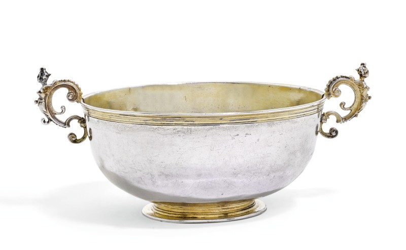 Lot 16. A German parcel-gilt silver bowl, maker’s mark a standing figure holding a flag, Danzig, first half of the 17th century. Plain circular form with moulded gilt rim, the ornate beaded scroll handles embellished with female busts, on a flat circular foot, 18.5cm 7 1/4 in. over handles, 253gr, 8oz 2dwt. Estimate 2,000 -3,000 GBP. Sotheby’s. 11/13/20