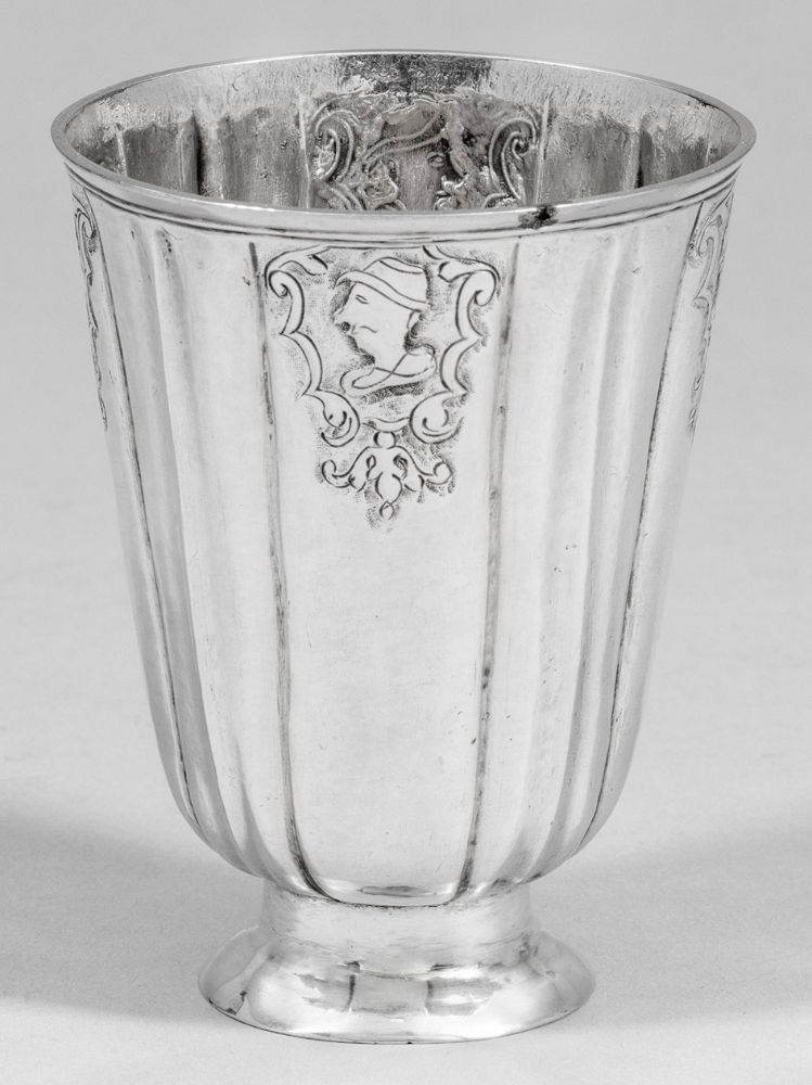 Lot 157. Breslauer Rokokobecher. Silber. Über flachem Stand sich konisch erweiternder Korpus, gegliedert durch Faltenzüge. Unterhalb des Lippenrandes feine Volutenkartuschen mit unterschiedlichen Porträtdarstellungen. Rand minim. best.; Gest., Tremolierstrich, Stadtmarke, Jahresbuchstabe C, Meister Christian Maximilian Schmidt (wird Meister 1712). Gew. ca. 80 g. H. 9,7 cm.