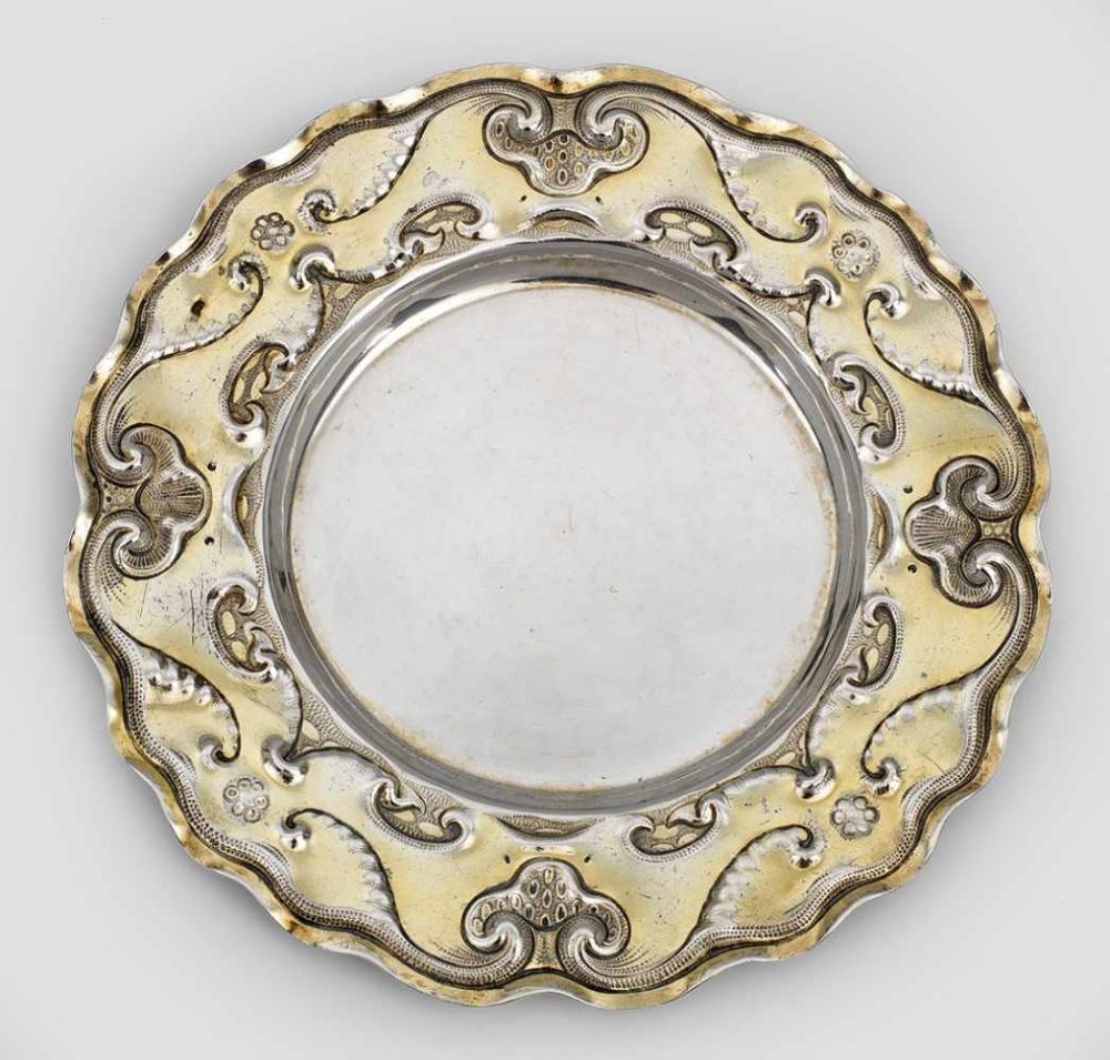 Lot 174. Seltene barocke Danziger Schauplatte. Silber, teilw. vergoldet. Leicht gemuldeter, glatter Spiegel. Breite, ausgestellte Fahne, reliefplastisch umzogen von fein punziertem Dekor im sog. Ohrmuschelstil. Passig geschweifter, schmaler Rand. Gest., Stadtmarke, Meister Hennick Probst (wird Meister 1655). Gew. ca. 260 g. D. 23 cm. Vgl. Czihak, S. 62, Nr. 358.