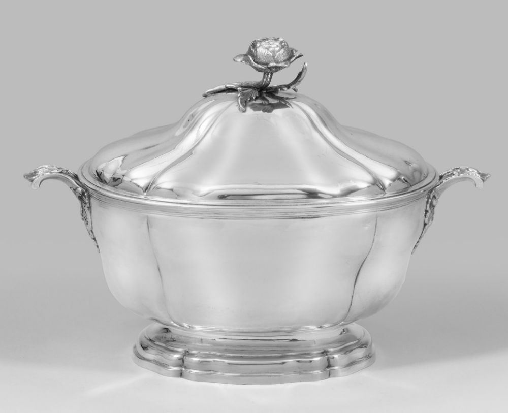 Deckelterrinen zieren seit dem Beginn des 18. Jhs. die adeligen Tafeln. Die Formgebung ist vielfältig. Die ersten Terrinen in den Goldschmiedezentren Augsburg und Berlin hatten einen runden Grundriss, ab ca. 1750 wurde der Korpus oval, verziert mit dezenten Rokokoelementen. Diese Terrine von Meister Hieroymus Holl III folgt in ihrer eleganten, auf wenig Zierrat beschränkten Formgebung den Berlinern Vorbildern.