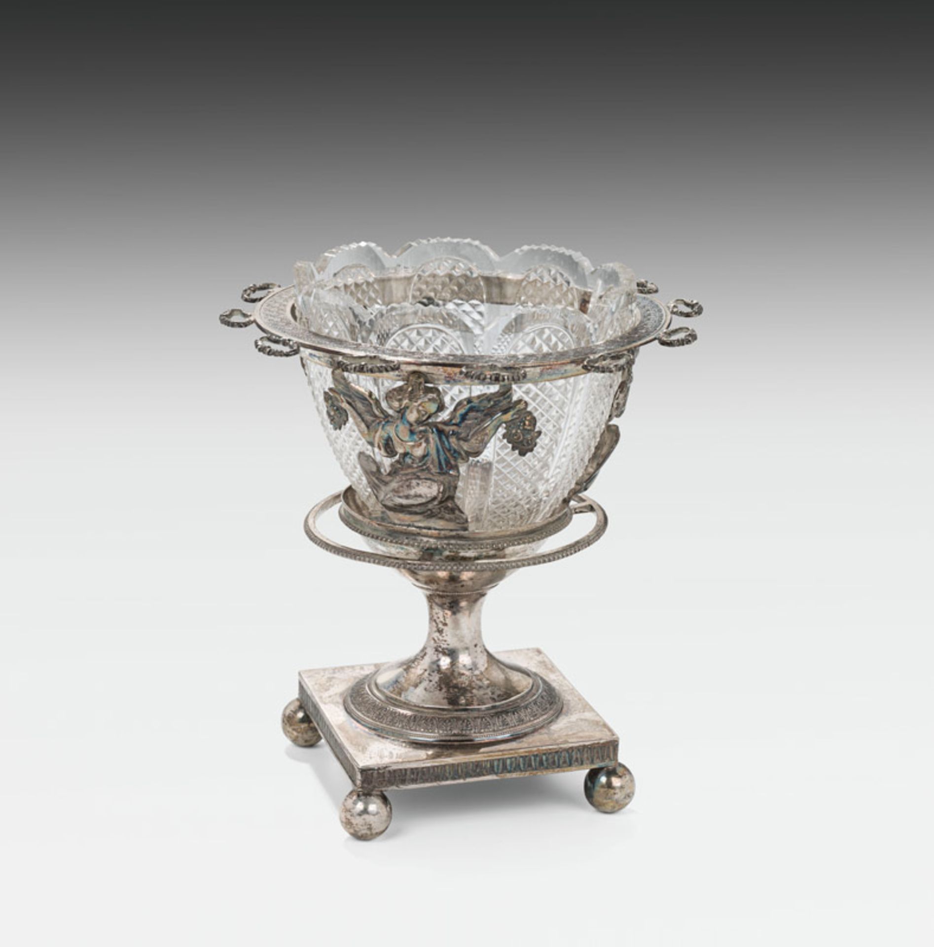 Lot 611. Aufsatzschale, Warschau, 1. Hälfte 19. Jh. Silber, getrieben, Glas; Silberschale mit drei Engeln; gemarkt: Meistermarke “Malcz” für Karol Filip Malcz, Silberfeingehalt 12 Lot; Glaseinsatz mit Steinelschliff, H. 18 cm; 445 g. Estimate 500 – 1,000 euro. Im Kinsky. 12/16/20. Sold 700 euro.