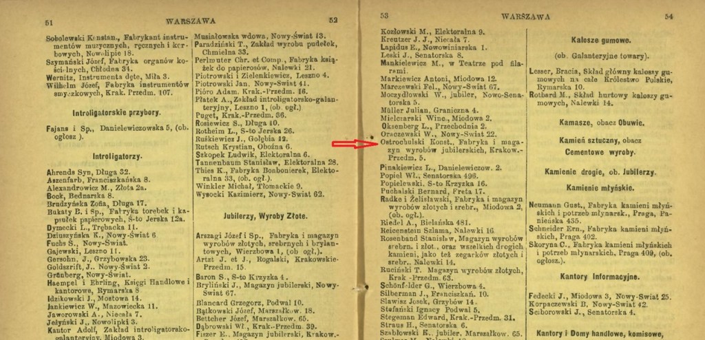 12 lat później, bo w roku 1883 znajdujemy w “Rafalskiego Warszawskim Roczniku Adresowym Firm Handlowych, Przemysłowych i Rękodzielniczych z Dołączeniem Adresów Znakomistrzych Firm Prowincji” adres firmy na stronie 54 jako “Konst. Ostrochulski,, Fabryka i magazyn wyrobów jubilerskich, Krakowskie Przedmieście 5“.