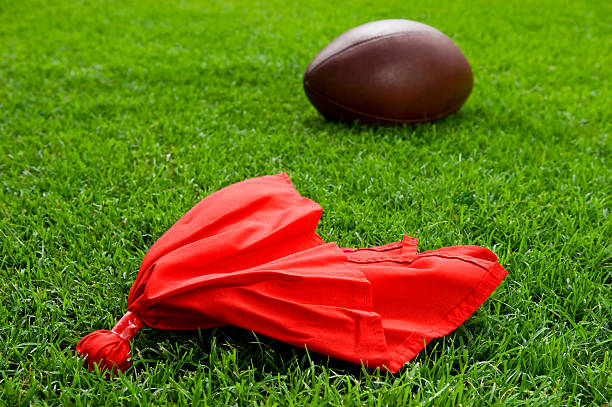 RED FLAG, jak na powyższej fotografii, rzuca na boisko head coach amerykańskiej drużyny futbolowej nie zgadzający się z decyzją sędziego. Sędzia zmuszony jest do dokładnego obejrzenia na monitorze kwestionowanej sytuacji i ma prawo do zmiany swojej decyzji.