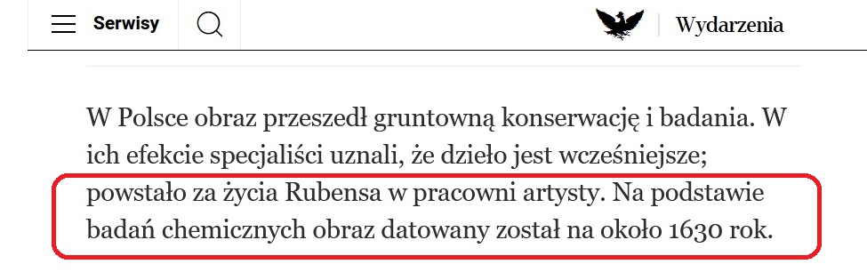 - Dwóch polskich ekspertów, których umiejętności i wiedza mogą być zasadnie podważane w oczach innych o ile to właśnie oni wydali samodzielne ekpertyzy o 1) warsztacie Rubensa i 2) datowaniu obrazu ‘około 1630 roku’.